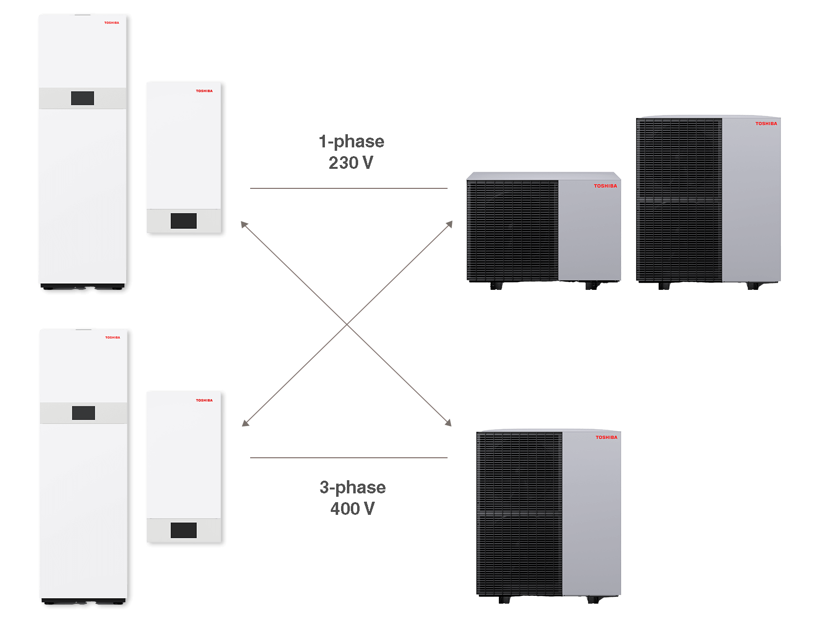 All outdoor and indoor units can be freely combined, even between different performance sizes and electrical connection types (1- and 3-phase).